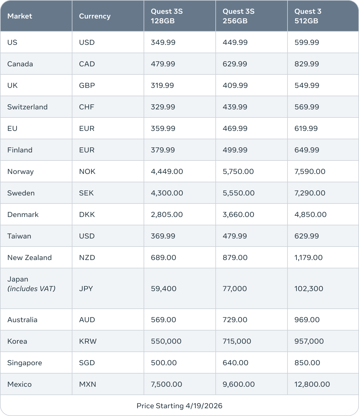 The new international pricing scheme for Quest 3 and Quest 3S follows below: