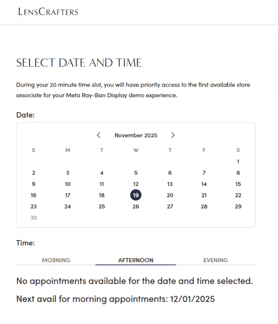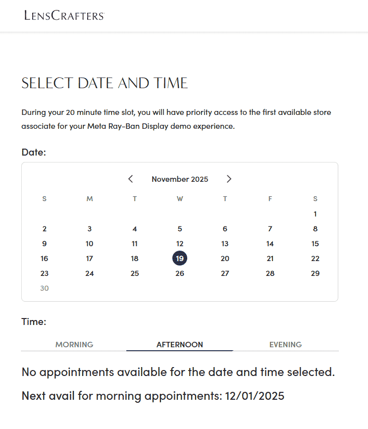 The easiest way to actually find a pair is by going to the Ray-Ban Display Scheduler and search by your zip code for participating nearby stores. From there, you should be able to use the “Schedule a demo” button to make an appointment. But it seems all participating stores link into a common scheduling system which is reporting no appointments available until December 1st… but the scheduler doesn’t actually let you look for appointments that far out.
