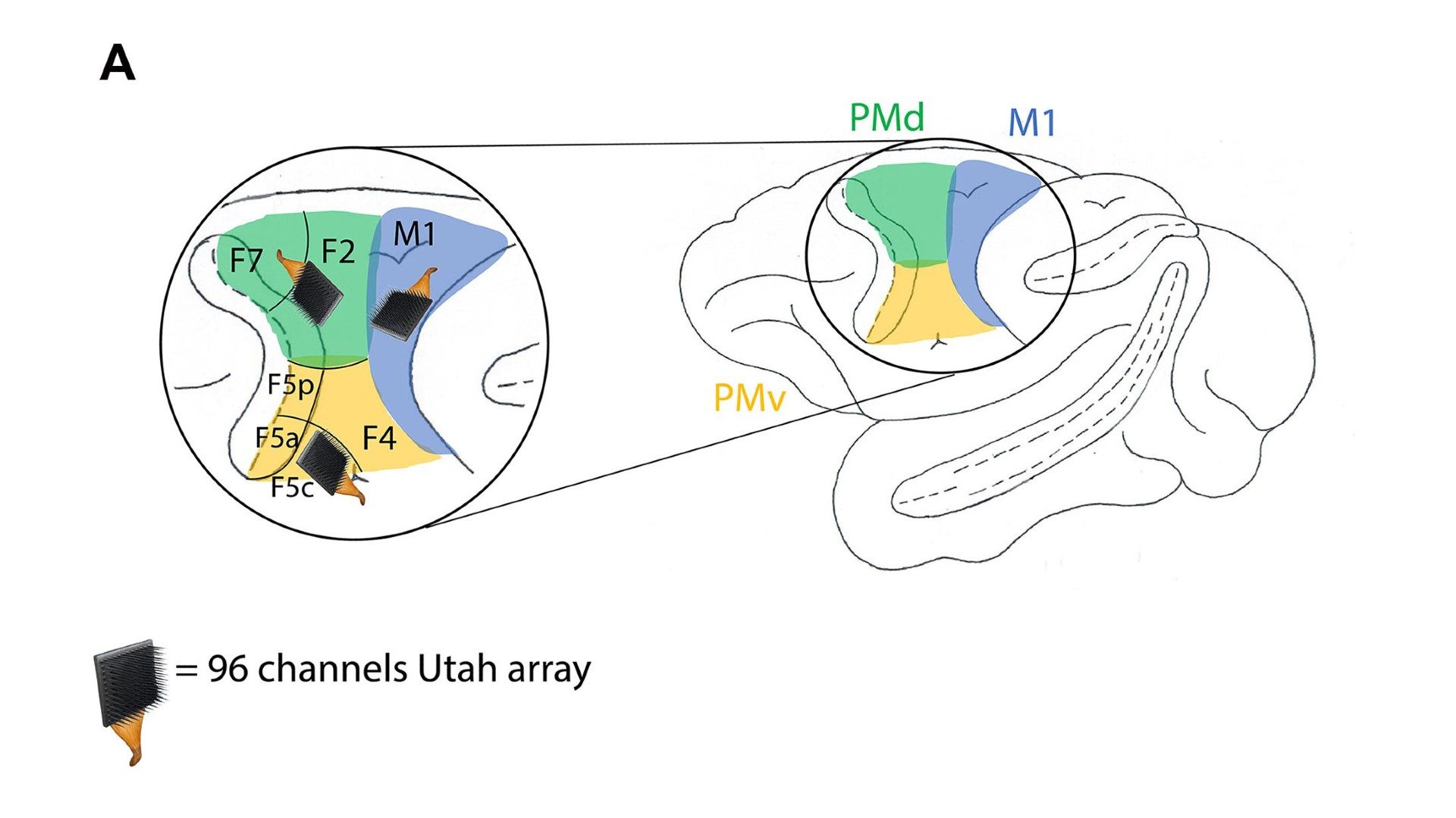 As reported in New Scientist, three rhesus macaques were implanted with Utah array BCI devices containing 96 electrodes in each of three brain regions: the primary motor cortex and the dorsal and ventral premotor cortices.
