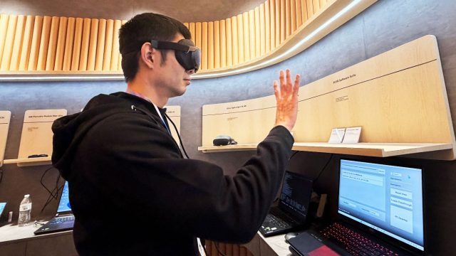 Adding to the confusion, Goertek calling the headset an “MR reference design” would generally be understood to mean a standalone device, but in the one photo we’ve been able to find of the device in use so far (courtesy CNFOL), it appears to be part of the company’s “PCVR Software Suite” display station, and looks to be tethered directly to the PC in front of the user.
